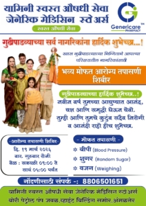 अमळनेर (प्रतिनिधी) “यामिनी स्वस्त औषधी सेवा जनरिक मेडिसिन स्टोअर्स” यांच्या वतीने गुरुपौर्णिमेच्या निमित्ताने १९ मार्च रोजी नागरिकांसाठी भव्य मोफत आरोग्य तपासणी शिबिराचे आयोजन करण्यात आले आहे. या उपक्रमामुळे परिसरातील नागरिकांना प्राथमिक आरोग्य तपासणीची उत्तम संधी उपलब्ध होणार आहे.