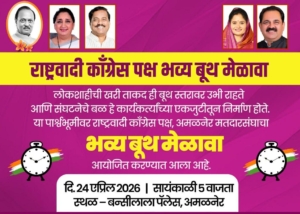 या मेळाव्यात आगामी राजकीय घडामोडी, संघटन मजबुती, तसेच बूथ स्तरावरील नियोजन आणि कार्यपद्धती याबाबत सखोल मार्गदर्शन करण्यात येणार आहे. विशेषतः प्रत्येक बूथ अधिक सक्षम करण्यासाठी कार्यकर्त्यांना दिशा देणे, जबाबदाऱ्या निश्चित करणे आणि संघटनात्मक बळ वाढवणे यावर भर दिला जाणार आहे. ‘प्रत्येक बूथ अधिक सक्षम करण्यासाठी हा मेळावा अत्यंत महत्त्वाचा आहे,’ असे नमूद करत सर्व बीएलए (बूथ लेव्हल एजंट), कार्यकर्ते, पदाधिकारी तसेच लोकप्रतिनिधींनी मोठ्या संख्येने उपस्थित राहावे, असे आवाहन करण्यात आले आहे. आपली उपस्थिती ही केवळ सहभाग नसून संघटनेच्या बळकटीसाठी महत्त्वपूर्ण योगदान ठरेल, असे सांगत “एकजुटीने कार्य करून अमळनेर मतदारसंघात राष्ट्रवादी काँग्रेस पक्ष अधिक सक्षम व प्रभावी बनवूया,” असे आवाहन आयोजकांकडून करण्यात आले आहे.
