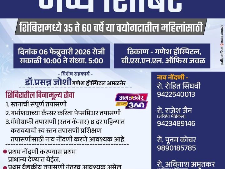 आजच्या धकाधकीच्या जीवनशैलीत महिलांचे आरोग्य अनेकदा दुर्लक्षित राहते. विशेषतः गर्भाशय व स्तन कर्करोग हे आजार सुरुवातीच्या टप्प्यात ओळखले गेले तर त्यावर यशस्वी उपचार शक्य असतात. मात्र जागरूकतेचा अभाव, तपासणीची भीती किंवा आर्थिक अडचणींमुळे अनेक महिला आवश्यक तपासण्या टाळतात. याच पार्श्वभूमीवर रोटरी क्लब अमळनेरने हा उपक्रम राबवण्याचा निर्णय घेतला आहे. सामान्यतः या तपासण्यांसाठी महिलांना ३५०० ते ४००० रुपये खर्च येतो. मात्र रोटरी क्लब अमळनेरच्या सामाजिक बांधिलकीतून या सर्व तपासण्या महिलांसाठी पूर्णतः मोफत उपलब्ध करून देण्यात येणार आहेत. या शिबिराच्या यशस्वी आयोजनासाठी रोटरी क्लब अमळनेरचे अध्यक्ष रो. देवेंद्र कोठारी, सचिव रो. आशिष चौधरी, डिस्ट्रिक्ट गव्हर्नर रो. ज्ञानेश्वर शेवाळे, डिस्ट्रिक्ट प्रोजेक्ट चेअरमन रो. प्रतिक जैन, प्रोजेक्ट चेअरमन रो. डॉ. प्रसन्न जोशी, तसेच मेडिकल कम्युनिटीचे डायरेक्टर्स रो. डॉ. राहुल मुठे आणि रो. डॉ. शरद बाविस्कर यांचे मोलाचे योगदान लाभत आहे. रोटरी क्लब अमळनेरचे सर्व सदस्य या उपक्रमासाठी सक्रिय सहभाग घेत आहेत. आरोग्य हीच खरी संपत्ती असून, नियमित तपासणीद्वारे सुरक्षित व निरोगी जीवन शक्य आहे, असा ठाम विश्वास आयोजकांनी व्यक्त केला आहे
